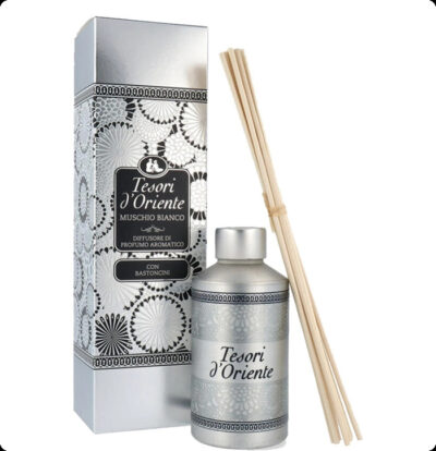 Tesori d’Oriente Muschio Bianco е ароматизатор за въздух с ратанови пръчки с изискан и нежен аромат на бял мускус. Създава усещане за чистота, мекота и елегантност, подходящо за всяко помещение в дома или офиса.